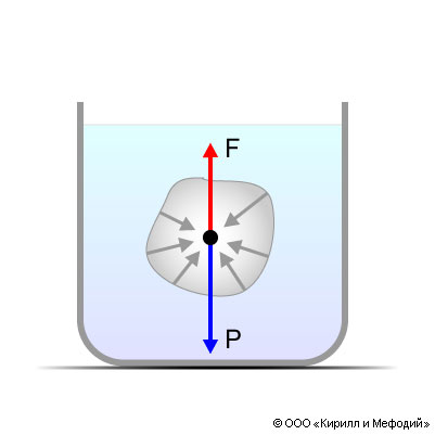 Закон Архимеда: F — выталкивающая сила; P — сила тяжести, действующая на тело.