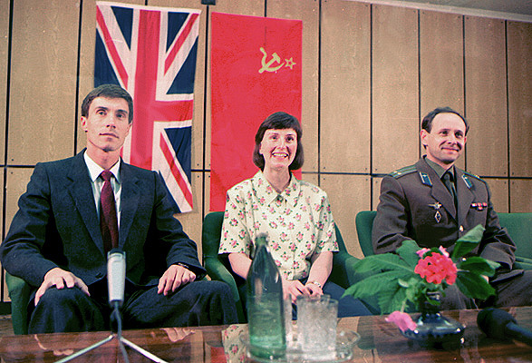 На снимке (справа налево) : командир корабля «Союз ТМ-12» подполковник А. П. Арцебарский, космонавт-исследователь Хелен Шарман и бортинженер летчик-космонавт СССР С. К. Крикалев во время предполетной пресс-конференции совместного российско-английского космического экипажа на космодроме Байконур 17 мая 1991 г.