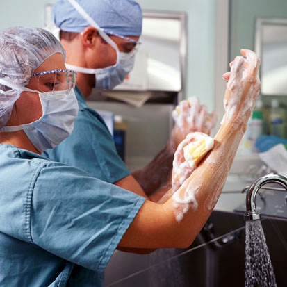 Хирурги и операционные сестры приступают к операции после мытья рук стерильными щетками по особой методике и обработки их средствами, убивающими микробов на поверхности кожи.