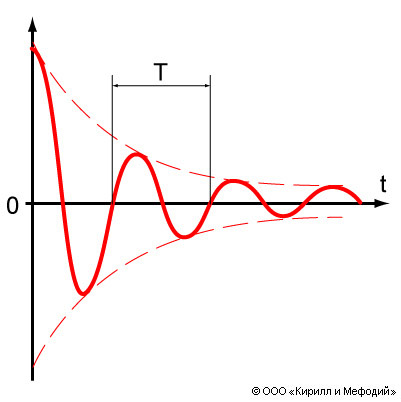График затухающих колебаний приближается к асимптоте, пересекая ее. Ось Ot — асимптота.