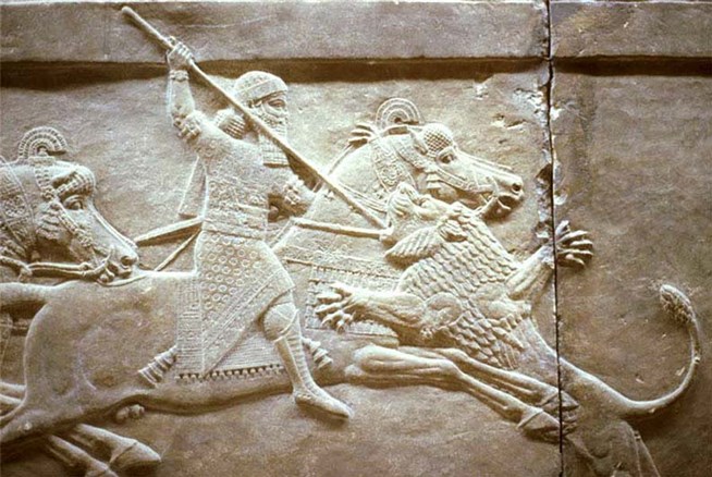 Большая львиная охота. 9 в. до н.э. Фрагмент рельефа из дворца в Нимруде. Британский музей. Лондон.