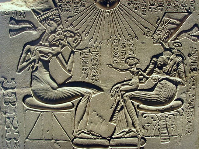 Атон над Эхнатоном и Нефертити. Государственные музеи Берлина.