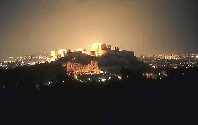 Афинский Акрополь. Здесь расположено большинство памятников античного искусства. Общее руководство застройкой Акрополя осуществлял древнегреческий скульптор Фидий. На снимке хорошо виден подсвеченный Пафенон.