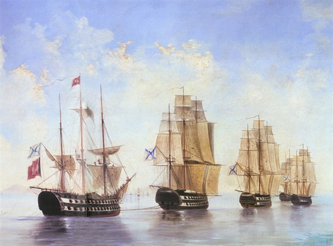 Л. Д. Блинов. «Эпизод Афонского сражения. Пленение турецкого линейного корабля «Сед-Эль-Бахр». 19 июня 1807 года». Копия с картины А. П. Боголюбова. 1885.