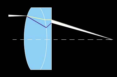Aхромат: сложная линза, состоящая из двух линз – собирательной и рассеивающей. Цветными линиями показан ход лучей, соответственно в желтой и сине-фиолетовой областях спектра.