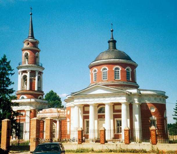 Ахтырская церковь строилась между 1821 и 1825 гг. Кубический храм с апсидальпыми выступами алтаря и притвора, увенчанный купольной ротондой, выполнен в строгих формах дорического ордера.