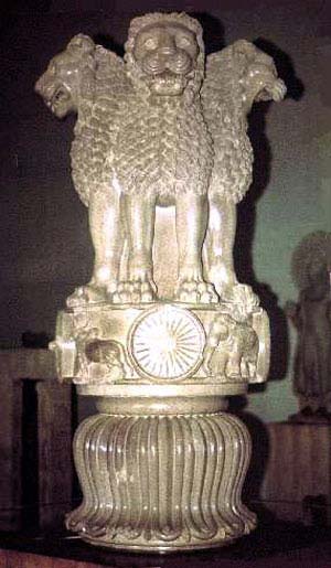 Львиная капитель из Сарнатха. Во времена правления Ашоки получили распространение мемориальные колонны (стамбхи) с высеченными указами правителя. Самая известная — Львиная капитель из Сарнатха. По преданию, она была установлена на месте, где Будда произнес свою первую проповедь. Середина 3 в. до н. э. Археологический музей, Сарнатх, Индия.