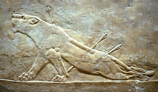 Раненая львица. Фрагмент рельефа из дворца Ашшурбанапала в Ниневии. Алебастр. Высота 70 см. 669 — около 635 гг. до н.э. Британский музей. Лондон.
