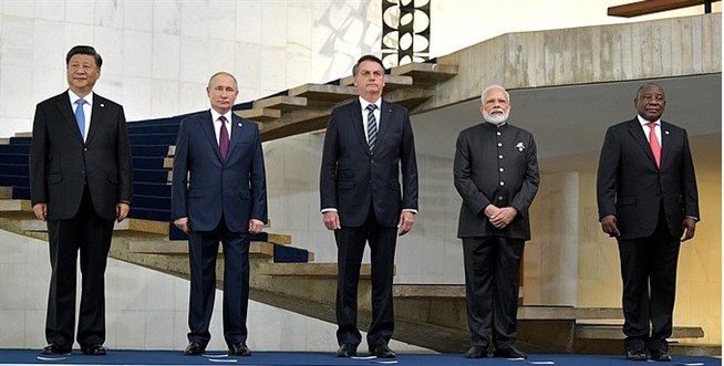 Встреча лидеров государств БРИКС на саммите в Бразилии. Председатель КНР Си Цзиньпин, Президент Российской Федерации Владимир Путин, Президент Бразилии Жаир Болсонаро. Премьер-министр Индии Нарендра Моди и Президент ЮАР Сирил Рамафоза, Бразилиа, 13 ноября 2019 г.