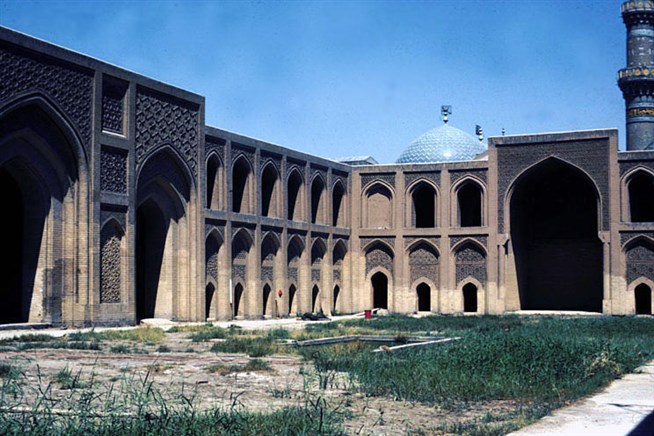 Двор медресе Мустансирия (начало 13 в., реконструирован в 20 в.) с двухъярусной аркадой и открытыми айванами со сталактитовым декором.