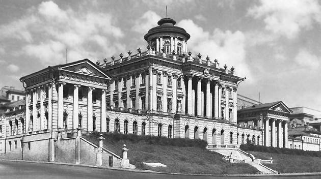 В. И. Баженов. Дом Пашкова (Москва). При строительстве этого дома архитектор сумел реализовать свои градостроительные идеи, возникшие, но не реализованные при проектировании перестройки Московского Кремля. Баженов переработал традиционную схему застройки усадьбы, поставив в один ряд на краю холма, противоположного Кремлю, центральное здание, увенчанное бельведером, и связанные с ним флигели (которые в других постройках обычно выступают вперед), что придало застройке городской облик. Вместо парадного двора (курдонера) создан сад (впоследствии уничтожен).