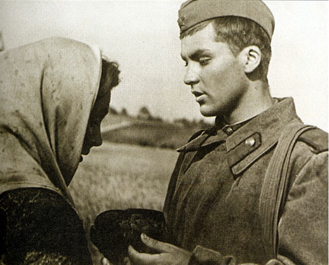 Алеша Скворцов (Владимир Ивашов) с матерью. Кадр из фильма «Баллада о солдате». 1959 год.