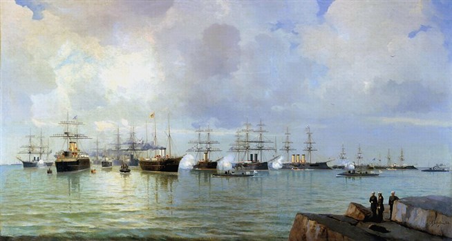 Леонид Демьянович Блинов (1867-1903). Смотр Балтийского флота на Транзундском рейде. 1896 год. Холст, масло. Центральный военно-морской музей, Петербург.