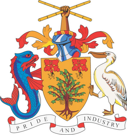 Герб Барбадоса был принят в 1965 году. На щите изображен бородатый фикус. Воздушные корни этих деревьев, сплетающиеся с ветвями, которые спускаются до земли, побудили испанцев назвать их «барбудос» (бородатыми). Впоследствии это название распространилось на сам остров. Тропическую растительность страны представляют на гербе также две местные орхидеи, известные под названием «Красная гордость Барбадоса». Животный мир острова и омывающих его вод олицетворяют щитодержатели — дельфин и бурый пеликан. Рыцарский шлем над щитом традиционен для геральдики бывших британских владений. Венок и намет имеют желто-красную расцветку, соответствующую цветам гербового щита и орхидей на нем. Увенчивающая герб рука держит два стебля сахарного тростника. Девиз в переводе с английского языка означает «Гордость и трудолюбие».