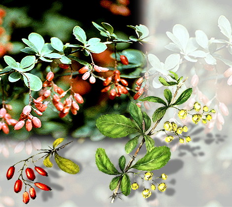 Барбарис обыкновенный. Ветви с цветками и плодами.