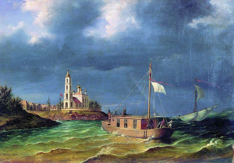 Антон Иванович Иванов (1818-1863). Барка братьев Чернецовых на Волге в Костромской губернии. 1841 год. Холст, масло. Русский музей, Петербург.
