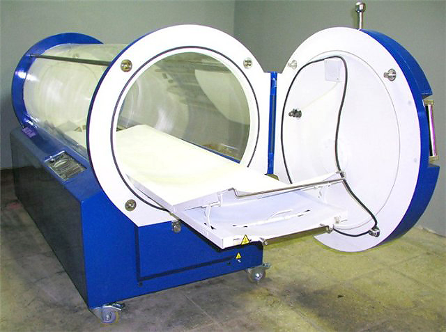 Гипербарическая барокамера с прозрачным цилиндрическим корпусом из органического стекла.