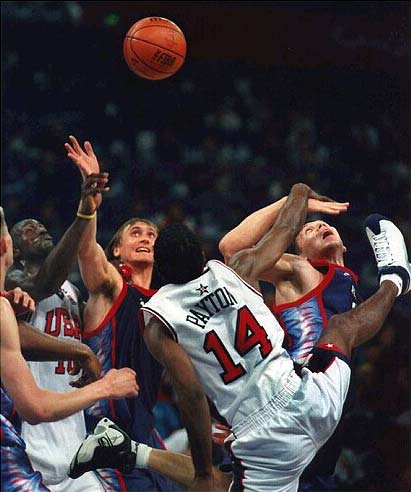 В игре «Дрим тим» — сборная команда США. Острый момент под кольцом.