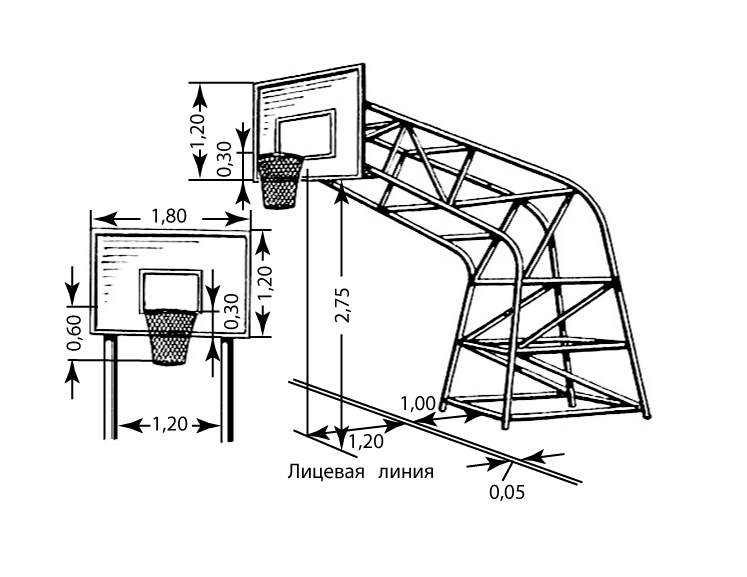Размеры баскетбольной стойки и щита (в м).