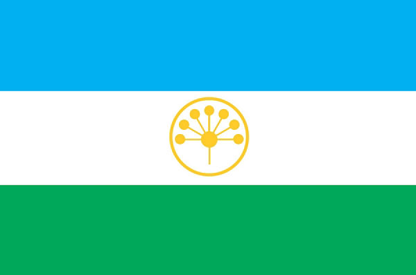 Флаг Башкирии (Республики Башкортостан) был принят 6 июля 1999 года. В центре белой полосы золотистым цветом изображена эмблема — круг, внутри которого находится стилизованный цветок курая, состоящий из семи лепестков. Лепестки курая символизируют семь родов, положивших начало консолидации башкирского народа. Окружность, обрамляющая цветок, — знак вечного движения.