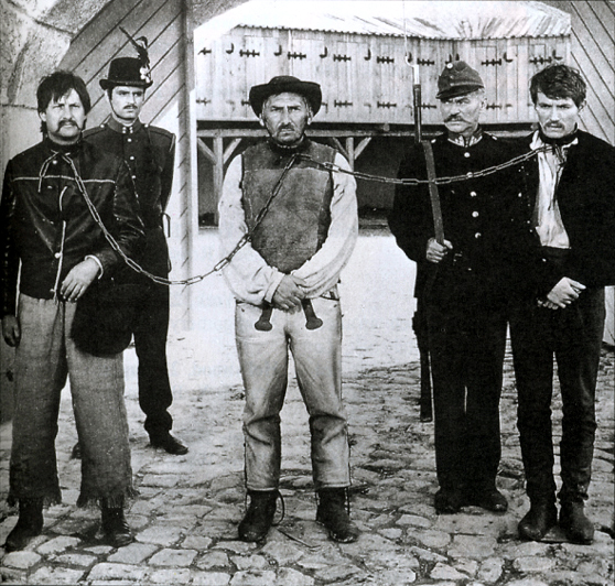 Арестованные повстанцы (Габор Агарди, Тибор Молнар, Андраш Козак). Кадр из фильма режиссера Миклоша Янчо «Без надежды». 1965 год.