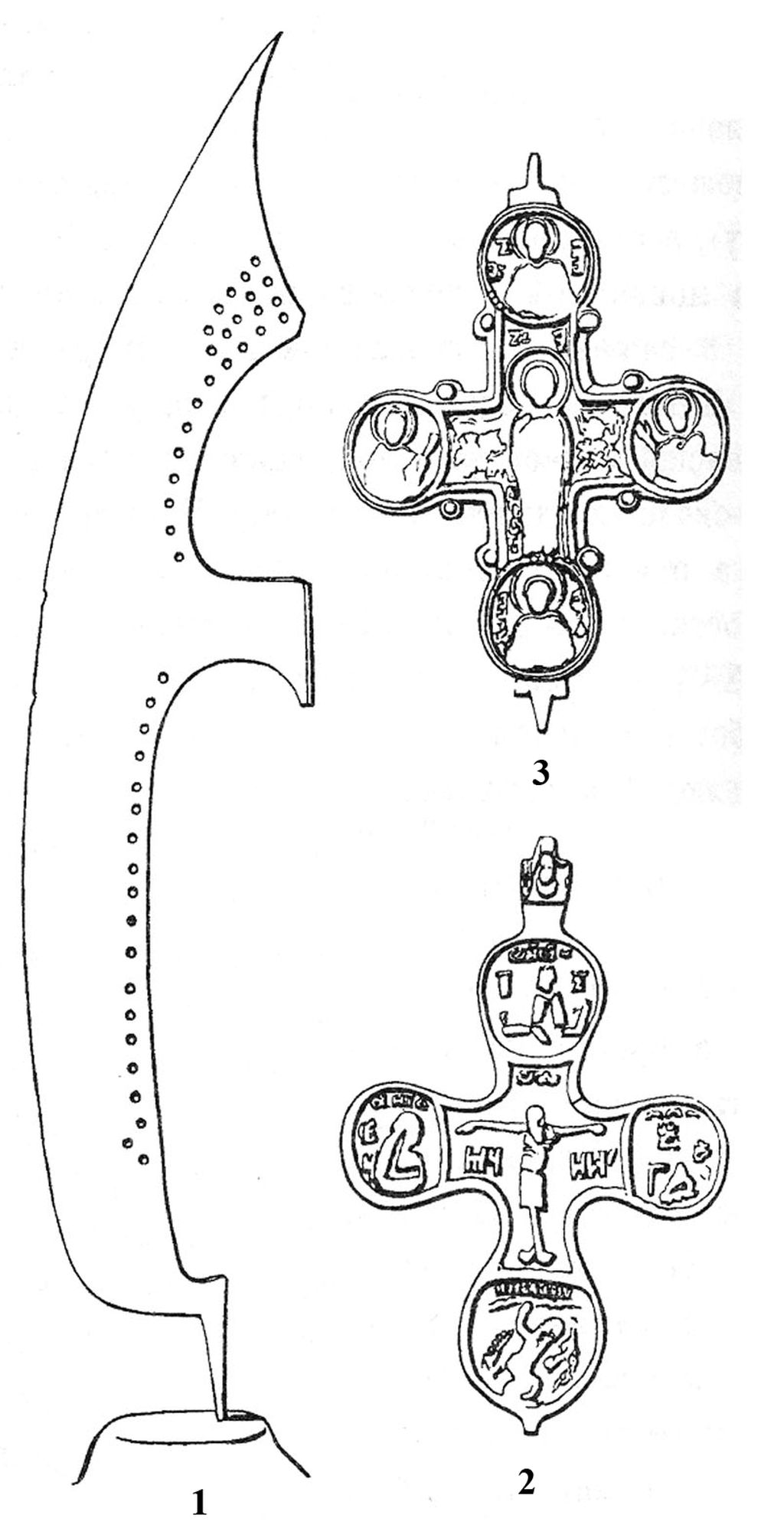 Рисунки найденных в результате археологических раскопок на Куликовом поле бердыша и крестов-энколпионов. 1 - бердыш, найденный в окрестностях села Монастырщины. 2 - четырехконечный кругломедальонный двусторонний нательный крест конца XV – XVII веков с рельефными изображениями Распятия и заключенных в медальоны полуфигур предстоящих, Троицы (вверху) и св. Никиты, побивающего беса. 3 - нижняя створка креста-энколпиона XIII-XIV веков с рельефным изображением в рост Богоматери Ассунты и полуфигурами святых в медальонах. Фото: Государственный военно-исторический и природный музей-заповедник Куликово поле, kulpole.ru