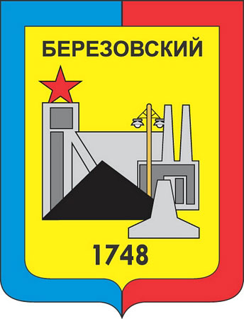 Герб города Березовский, принятый в 1972 году. Красно-голубой фон соответствует цветам флага РСФСР. На щите изображено название города, дата его образования, связанная с открытием первого рудного золота в России, и символы горнодобывающей промышленности и строительной индустрии.
