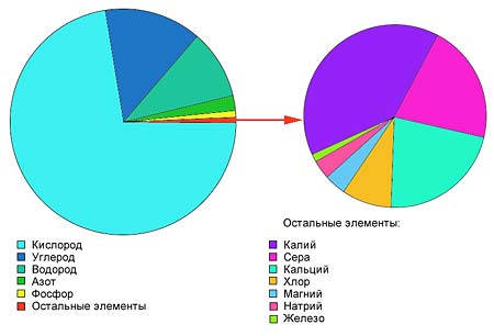 Основу клеток всех живых организмов составляют четыре химических элемента: кислород, углерод, водород и азот. На их долю приходится около 98% всего содержимого клетки. Большинство остальных химических элементов содержится в клетках в значительно меньшем количестве, из-за чего их называют микроэлементами.