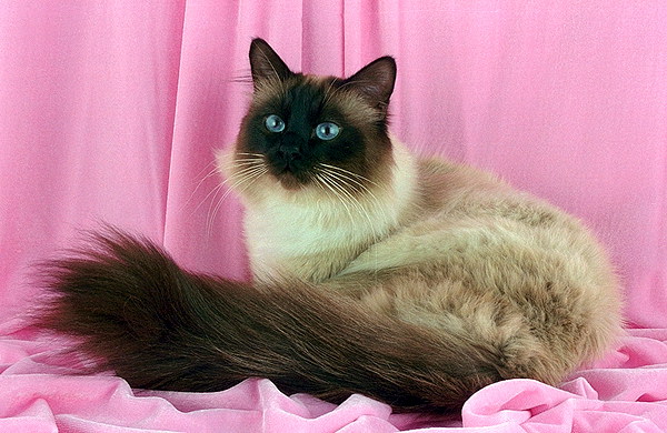 Бирманская кошка сил-пойнт (с темно-коричневыми отметинами).