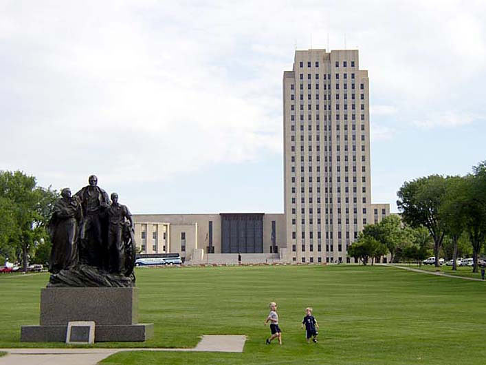 Бисмарк. Капитолий штата Северная Дакота (1932) и памятник «Семья пионера». Высота Капитолия — 73 м.