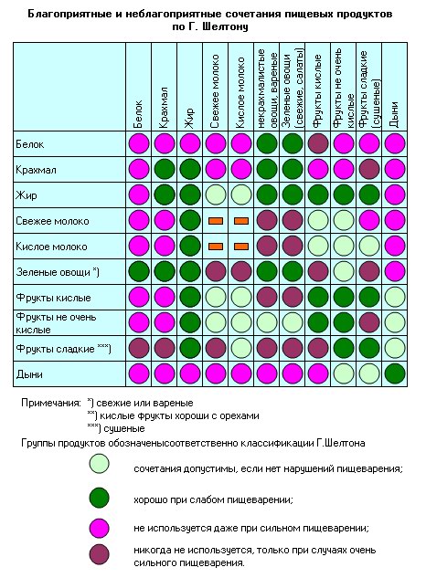 Благоприятные и неблагоприятные сочетания пищевых продуктов по Г.Шелтону.