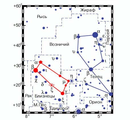 Созвездие Близнецов с двумя яркими звездами — Кастором (α) и Поллуксом (β). Наиболее благоприятные условия видимости в декабре – январе. Видно на всей территории России.