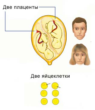 Разнояйцевые близнецы появляются на свет в том случае, если при овуляции из яичников выделились две или более яйцеклеток и каждая из них была оплодотворена. Разнояйцевые близнецы непохожи друг на друга и могут быть разного пола.