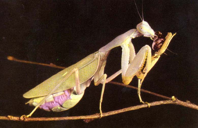 Богомол. Подстерегая добычу, мелких летающих насекомых, он «молитвенно» складывает передние лапки — отсюда название.