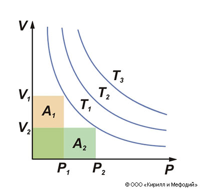 Зависимость объема V идеального газа данной массы от давления p при постоянной температуре T. Изотермы T1, T2, T3 являются равносторонними гиперболами, площади A1 и A2 равны постоянной C, то есть согласно закону Бойля – Мариотта: pV=C=const. T3 > T2 > T1.