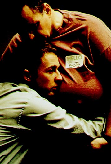 Эдвард Нортон в роли Джека, Мит Лаф в роли Боба. Фильм «Бойцовский клуб».