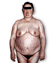 Лунообразное лицо, избыточное отложение жира на груди, на животе, полосы растяжения (стрии).