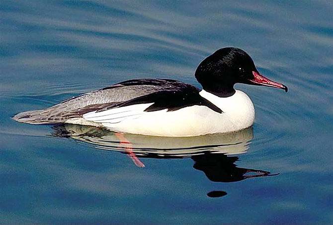 У самца большого крохаля (Mergus merganser) голова и верхняя часть шеи черные с металлическим блеском, остальная часть шеи, бока и низ тела белые.