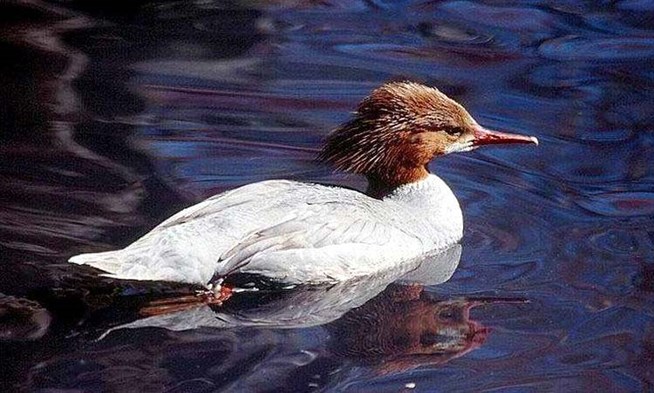Самка большого крохаля (Mergus merganser) отличается рыжим оперением головы с двойным широким хохлом.