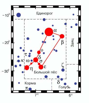 Созвездие Большого Пса. Наиболее благоприятные условия видимости в декабре – январе. Видно в южных районах России.