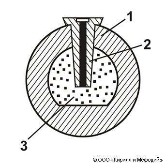 Схема бомбы гладкоствольной артиллерии: 1 – чугунный корпус; 2 – деревянная трубка с запрессованным порохом; 3 –заряд черного пороха.