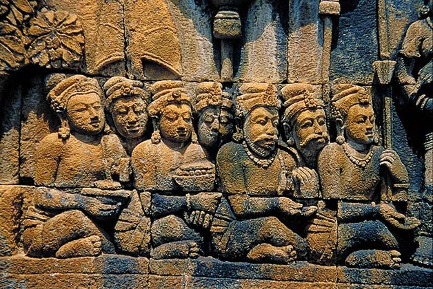 На стенах обходов нижних террас — 1460 рельефов из жизни Будды. Скульптура Боробудура замечательна лирической мягкостью и ритмичностью, чувственным обаянием, ощущением гармонии бытия, богатством жизненных фольклорно-жанровых мотивов.