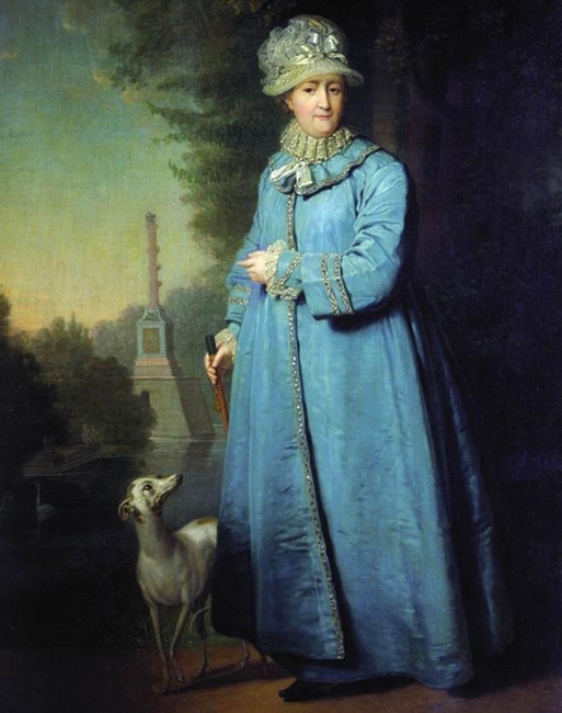 В.Л. Боровиковский. Екатерина II на прогулке в Царскосельском парке (с Чесменской колонной на фоне). 1794 год. Холст, масло. Третьяковская галерея, Москва.