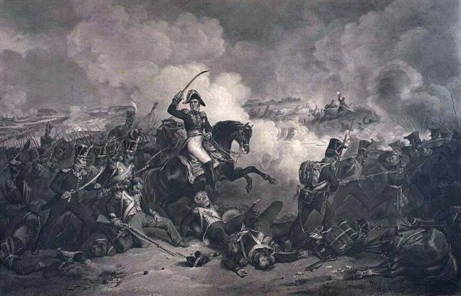 Бородинское сражение. Атака 3-го пехотного корпуса маршала Нея на Семеновские флеши. Гравюра Кенига с картины Жана-Шарля Ланглуа. Первая половина 19 века.