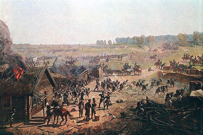Фрагмент панорамы Ф. Рубо «Бородинская битва». Командный пункт генерала Д. С. Дохтурова. После ранения Багратиона в командование левым флангом вступил генерал Дохтуров (на переднем плане у барабана).