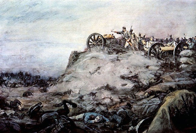 На артиллерийской позиции. Русская батарея на флешах Багратиона. Художник Р. Горелов. 1955.