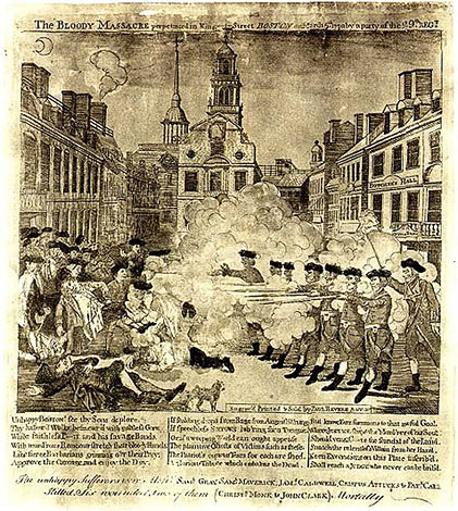 Бостон. Гравюра Пола Ривера «Бостонская резня», изображает побоище, устроенное англичанами на Кинг Стрит в 1770.