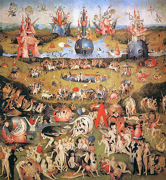 Иероним Босх. Сад земных наслаждений. Около 1510 года. Прадо, Мадрид. «Сад земных наслаждений» — самый большой триптих Босха. На фоне подобного парку пейзажа под ясным небом в окружении причудливых растений, а порой и внутри растений, обнаженные люди предаются наслаждениям и созерцают услады любви. Характерное для Босха обилие алхимико-астрологической символики достигает в «Саде земных наслаждений» апогея.