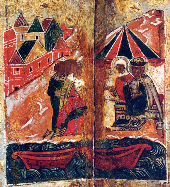 Бояре призывают Петра и Февронию вернуться на княжение. Клеймо иконы Муромских святых князя Константина со чадами Михаилом и Феодором, Петра и Февронии и Иулиании Лазаревской с житием Петра и Февронии. XVII век. Фото: pravoslavie.ru