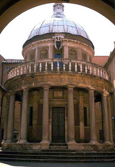 В этой небольшой часовне, окруженной дорической колоннадой и расчлененной в обоих ярусах полукруглыми нишами, Браманте достиг наибольшей пластической цельности и ясности. Поиски Браманте совершенного центрического сооружения во многом были восприняты Рафаэлем и другими итальянскими архитекторами.